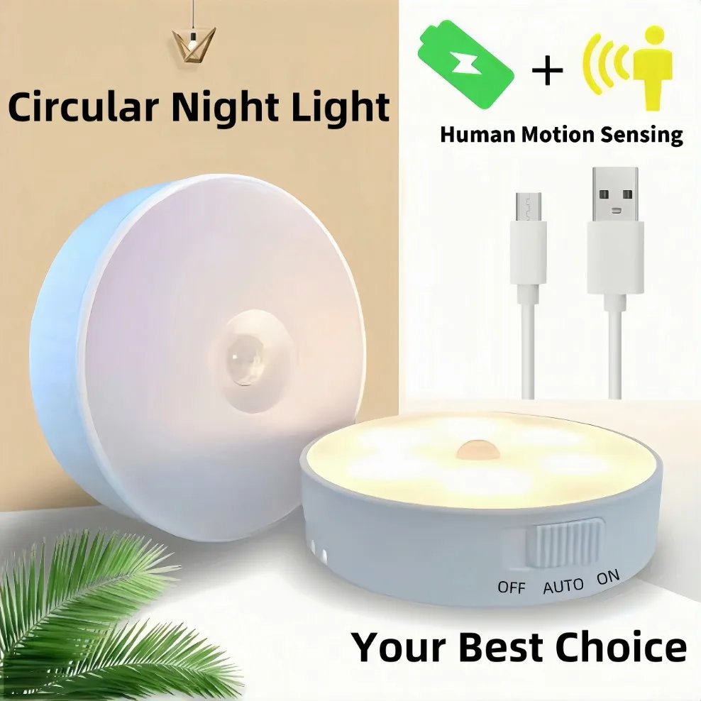 LED Motion Sensor Light USB Mini Night Lights Round Chargeable Lamp For Bedroom Kitchen Stair Hallway Wardrobe Lighting Cupboard