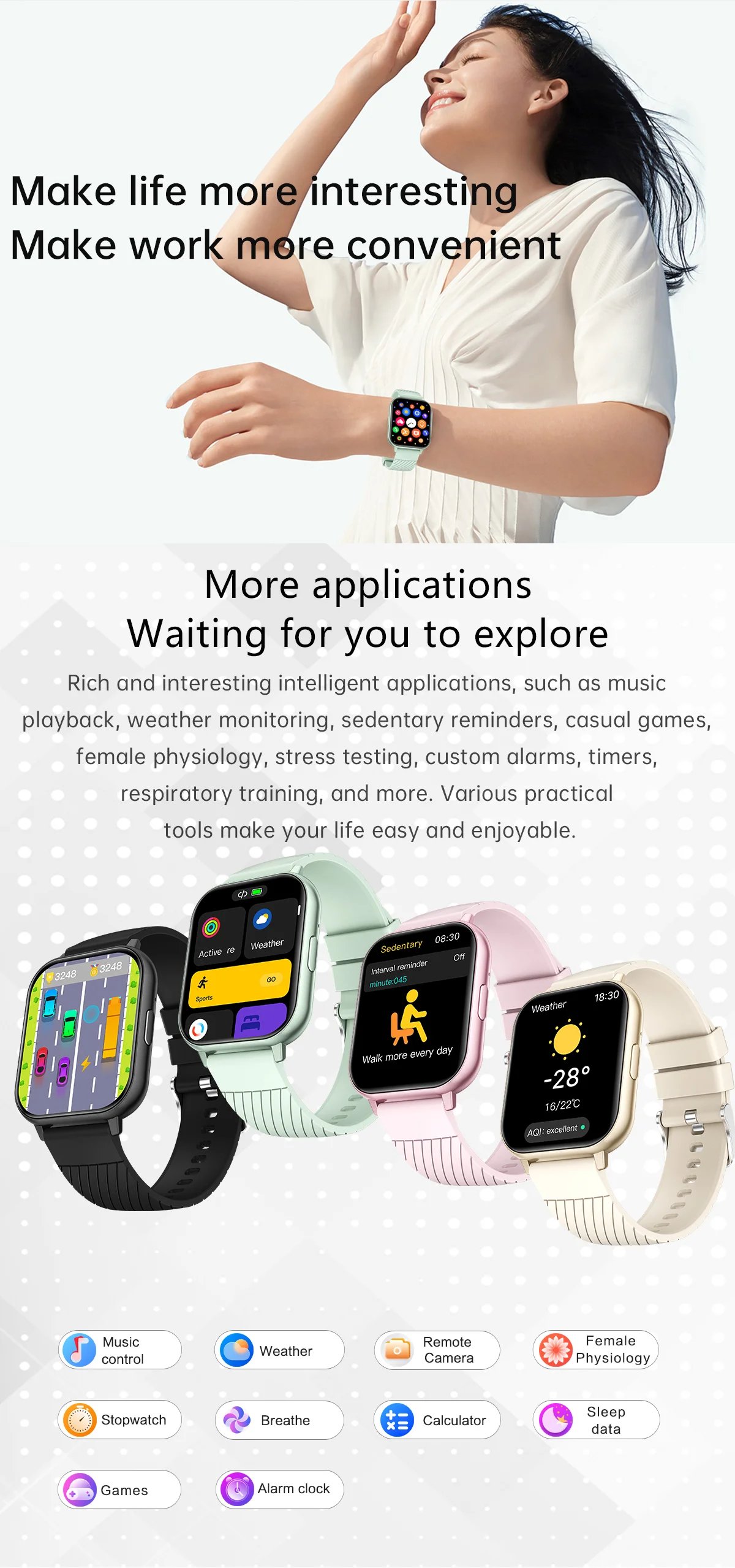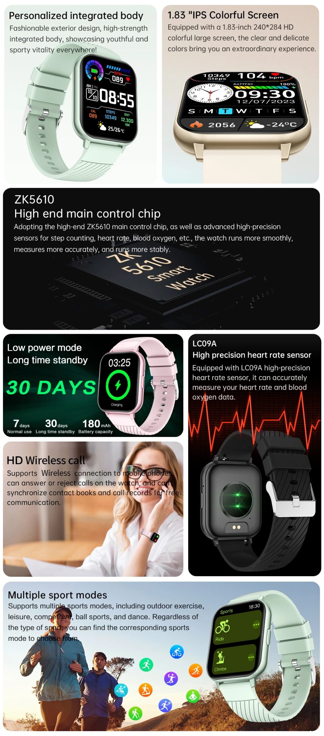 Bluetooth Call, full screen touch, heart rate, blood oxygen, pressure, exercise, exercise recording (steps, distance, calories), exercise mode, voice assistant, message push, information storage, sleep monitoring, weather push, alarm clock, timer, stopwatch, calculator, stress relief sleep aid, world clock, camera remote control, music control, find phone, off screen clock, women’s health, etc.