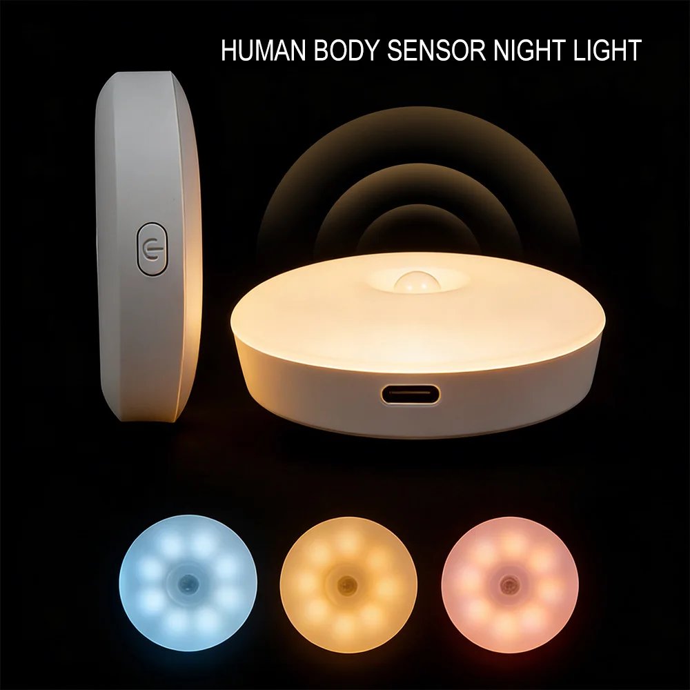 LED Motion Sensor Light USB Mini Night Lights Round Chargeable Lamp For Bedroom Kitchen Stair Hallway Wardrobe Lighting Cupboard